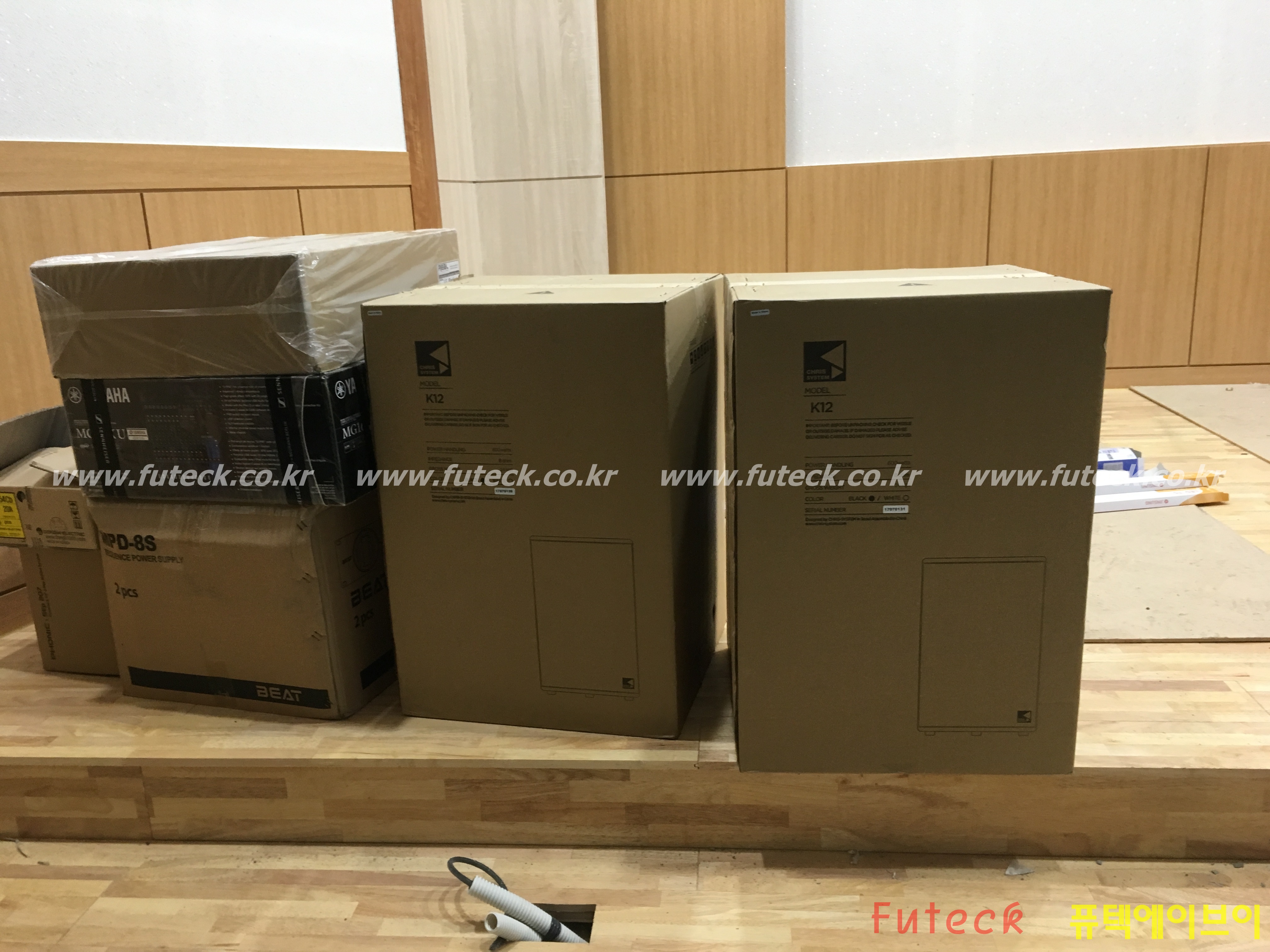 충주에 위치한 산척드림교회 신축현장에 음향장비들을 설치하였습니다. 설치한 크리스 시스템의 K12스피커와 야마하 믹서, 기타 장비 사진들 shure 구즈넥 마이크 마이크 베이스 반주기 스피커를 공중에 메달 준비를 하고 있습니다. 마이크 설치중 스피커와 함께 전동바텐도 설치 하였습니다. 설치 완료 모습